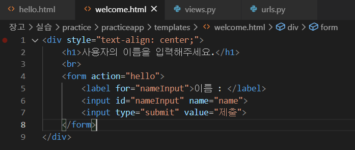 세 번째 인자 : 다른 html 파일에서 welcom url을 번거롭게 입력하는 대신 name을 대신 사용 가능