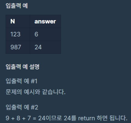 예를들어 N = 123이면 1 + 2 + 3 = 6을 return 하면 됩니다.