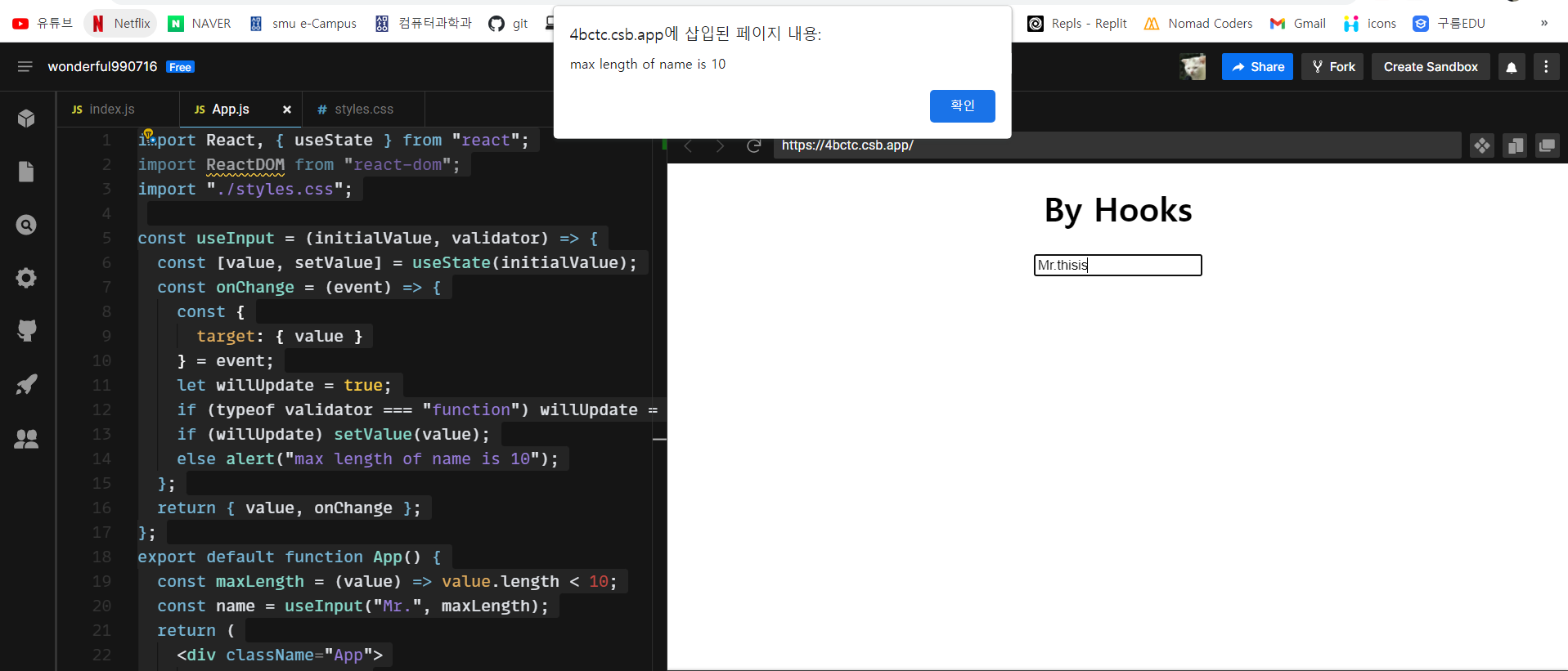 - initialValue로 "Mr.", validator함수로 maxLength를 useInput의 인자로 전달한다.
