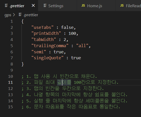 4. 재실행 후 프로젝트 폴더에 Prettier 설정 파일을 생성하여(파일 이름에 반드시 온점 '.'을 포함) 아래와 같이 입력한다.