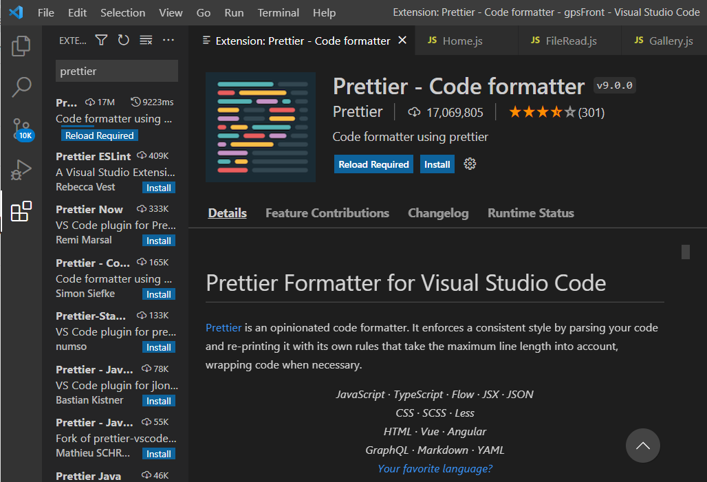 1. react의 extension(왼쪽 nav bar 맨 아래)에서 Prettier를 검색한다.