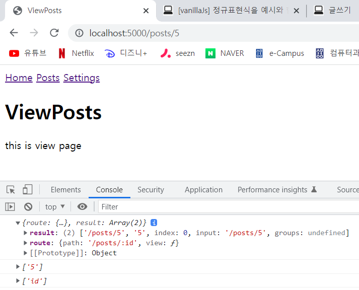 → 현재 동적라우팅에 대해 "/posts/:id"의 id 값이 5임을 저장하는 배열이다.