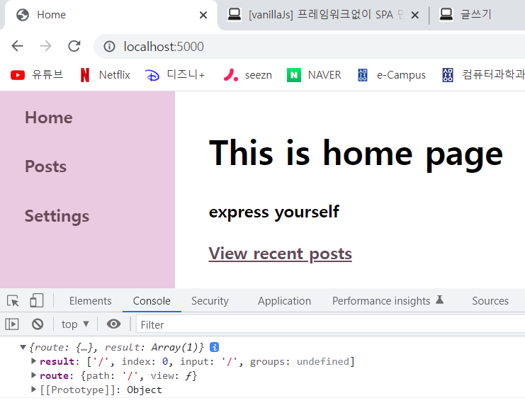 그럼에도 늘 React로만 라우터 코드를 작성해왔어서 javascript로만 라우팅 코드를 작성해본 것은 좋은 경험이었다.