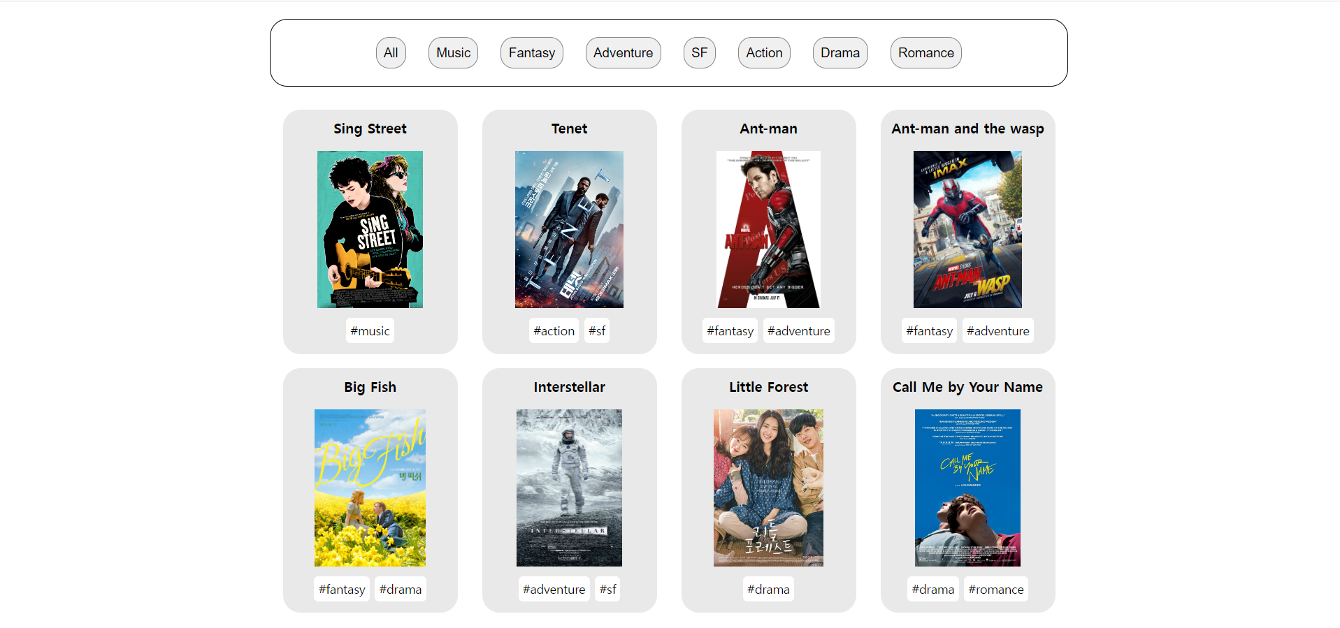 - 카테고리를 선택하면 해당 카테고리를 tag로 가진 영화들이 화면에 보이게 된다.