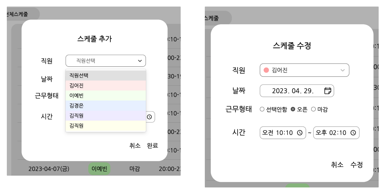 이에 스케줄 및 출근부의 작성과 수정 시 직원을 선택할 때 색도 함께 보여주어야만 하는데
