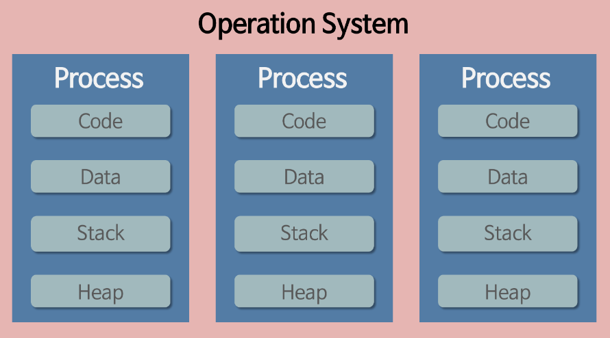 - 프로세스는 각각 code, data, stack, heap의 구조로 되어있는 독립된 메모리 영역을 가진다.