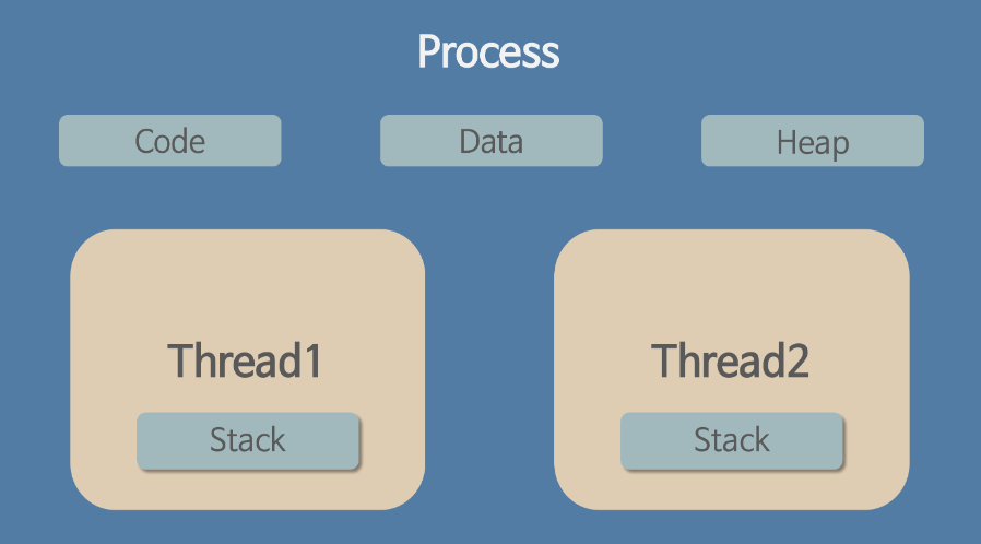 - 스레드는 프로세스 내의 stack을 제외한 code, data, heap, stack을 공유한다.