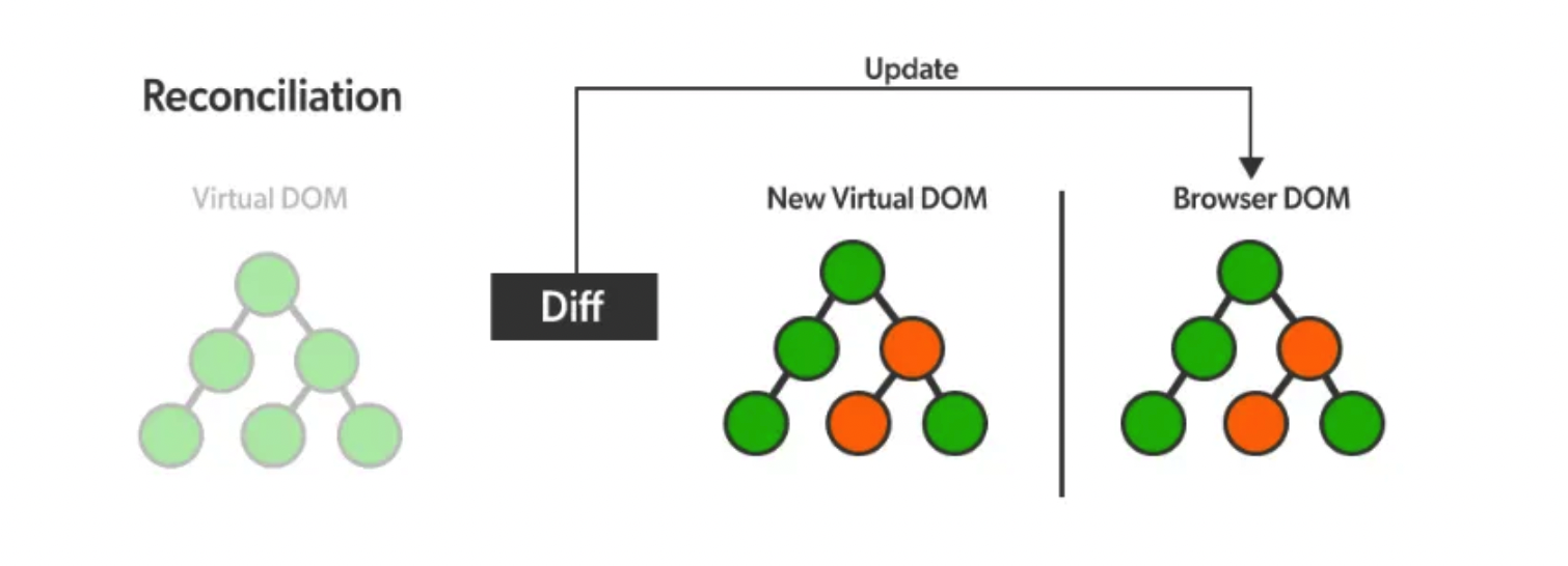 React는 렌더링 이전의 화면 구조를 나타내는 가상 돔과 렌더링 이후에 보이게 될 화면 구조를 나타내는 가상 돔을 가지고 있다. 두 가상 돔을 비교하여 어떤 element가 변했는지 알아내는 과정을 Diffing 이라고 하고, 차이가 발생한 부분만을 실제 dom에 적용한다. 이 과정은 Reconciliation(재조정)이라고 한다.