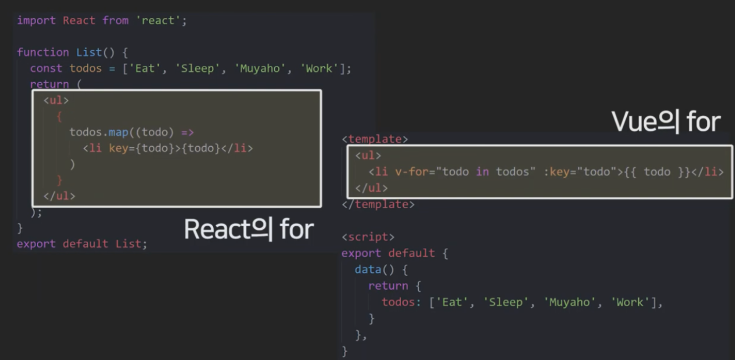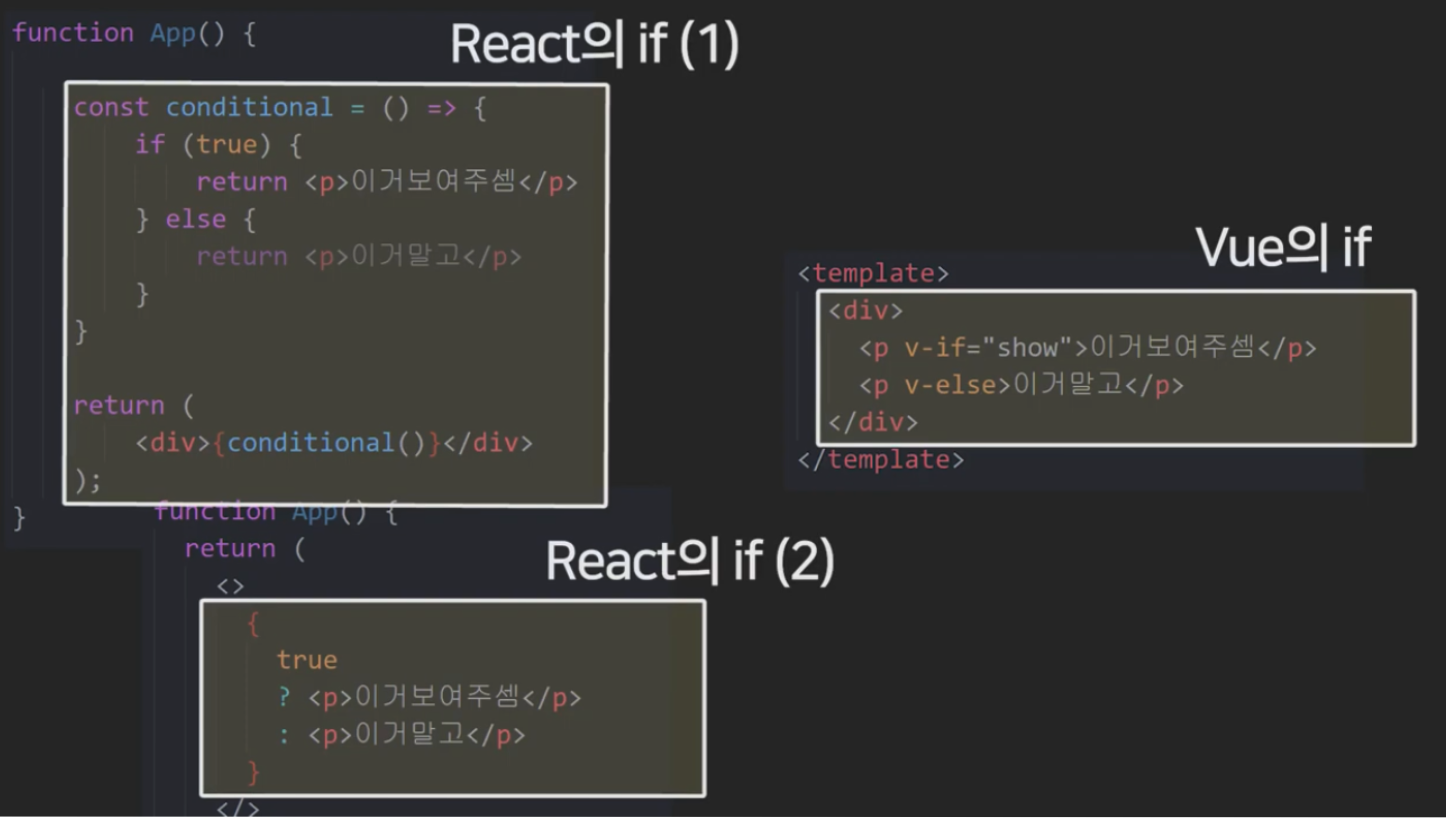 •React에서 모든 컴포넌트는 JSX를 사용해 JSX의 툴을 이용해 Vue의 템플릿보다 진보된 기능을 사용할 수 있다.