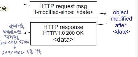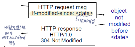 조건부GET : 웹 캐시의 객체가 최신 버젼이면 서버가 객체를 보내지 않음