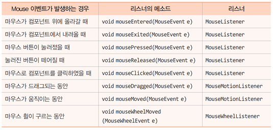 -마우스 이벤트 처리를 위해 마우스 리스너를 구현 할 때는 리스너의 추상 메소드 5개를 모두 구현 해야 한다. 만약 딱히 하는 일이 없는 메소드가 있다면 empty body로 내부 구현을 안하면 된다.