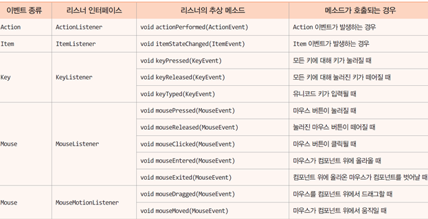 - 동작 : 자바 가상 기계로부터 이벤트의 발생 정보를 받아와 이벤트 소스와 이벤트 종류를 결정하고, 적절한 이벤트 객체 생성한다. 그 후에 이벤트 리스너를 찾아 호출