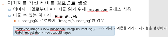 - JLabel(Icon image) : 이미지 파일로부터 이미지 읽어올 때