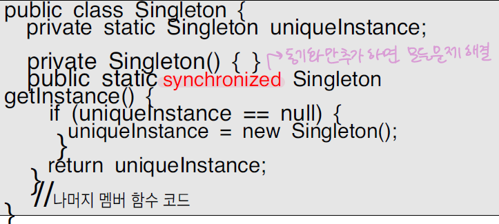 해결 방법 : getinstance() 함수에 동기화 시키는 코드 삽입